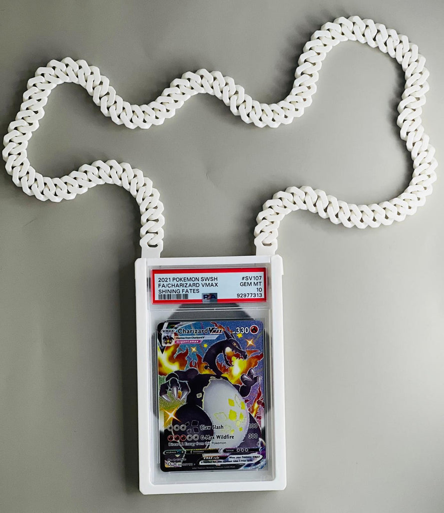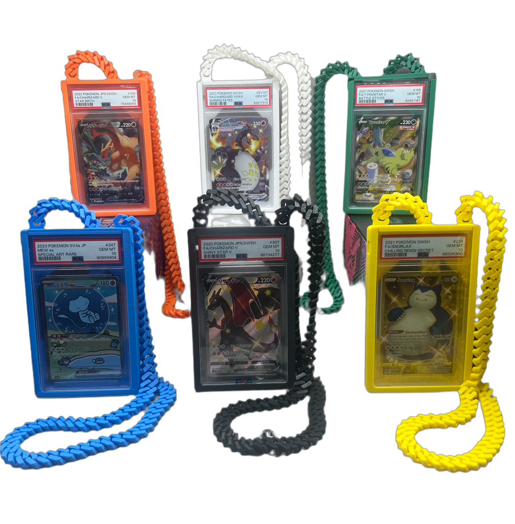 Discover the perfect blend of fashion and fandom with our Pokemon Card Slab Necklaces Collection: Displays By Stewy. The chain and pedant allows you to showcase your favorite Slab in a stylish and eye-catching way.